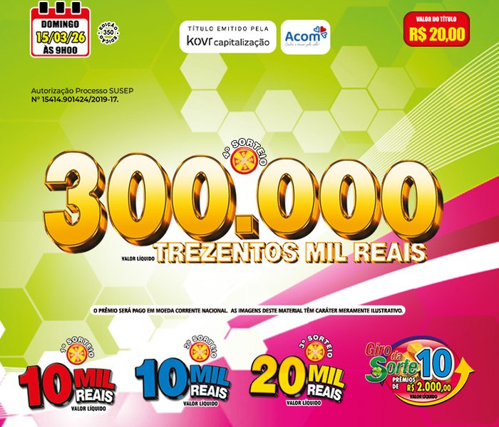 Sorteios decorrentes de Títulos de Capitalização de Pagamento Único, da Modalidade Filantropia Premiável, emitidos pela INVEST Capitalização S/A., inscrita no CNPJ sob nº 93.202.448/0001-79 e aprovados pela SUSEP. Você pode ajudar a ASSOCIAÇÃO DO COMBATE AO CÂNCER DO CENTRO-OESTE DE MINAS -ACOM comprando o Centro Oeste Cap e cedendo o direito de resgate. A aprovação deste Título pela SUSEP não implica, por parte da Autarquia, em incentivo ou recomendação a sua aquisição, representando exclusivamente, sua adequação às normas em vigor. Antes de contratar, consulte previamente as Condições Gerais.